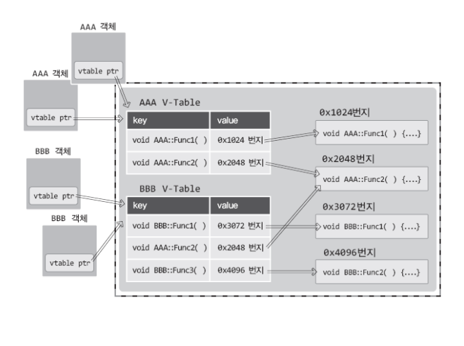 가상 함수 테이블에는 key가 있고 value가 있다. 여기서 key는 호출하고자 하는 함수를 구분지어주는 구분자의 역할을 한다. 그리고 value는 구분자에 해당하는 함수의 주소정보를 알려주는 역할을 한다. 그래서 AAA 객체의 Func1 함수를 호출해야 하는 경우, 위의 테이블에 첫 번째 행의 정보를 참조하여 0x1024번지에 등록되어 있는 Func1 함수를 호출하게 되는 것이다.