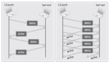 위 그림의 왼쪽은 이전 에코 클라이언트의 데이터 송수신 방식을, 그리고 오른쪽은 입출력 루틴을 분리시킨 에코 클라이언트의 데이터 송수신 방식을 보여준다. 일단 서버에서의 차이는 없다. 차이가 나는 부분은 클라이언트 영역이다. 입출력 루틴이 분리된 클라이언트는 데이터의 수신 여부에 상관없이 데이터 전송이 가능하기 떄문에 연속해서 데이터의 전송이 가능하다. 따라서 동일한 시간 내에서의 데이터 송수신 분량이 상대적으로 많을 수밖에 없다. 그리고 이러한 성능적 차이는 데이터의 전송 속도가 느린 환경에서 더 확실히 드러난다.