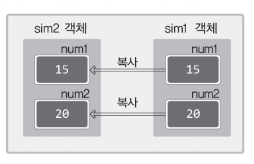 순수히 멤버 대 멤버 간 복사가 일어난다. 디폴트 복사 생성자는 얕은 복사의 형태로 객체 간 복사한다.