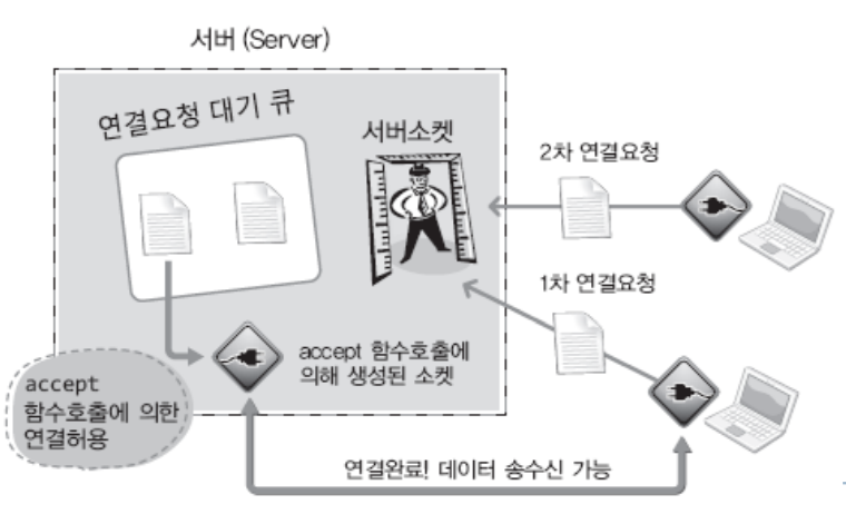 - addrlen : 두 번째 매개변수 addr에 전달된 주소의 변수 크기를 바이트 단위로 전달. 단, 크기 정보를 변수에 저장한 다음에 변수의 주소 값을 전달한다. 그리고 함수 호출이 완료되면 크기정보로 채워져 있던 변수에는 클라이언트의 주소 정보 길이가 바이트 단위로 계산되어 채워진다.