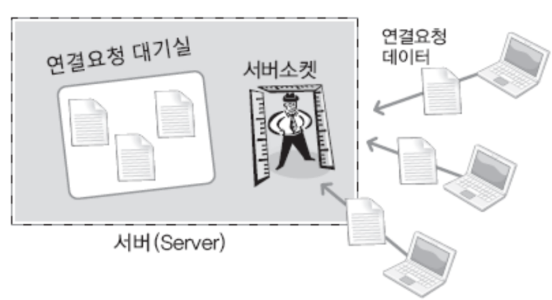 listen 함수가 호출되면 서버 소켓이 만들어지고, listen 함수의 두 번째 인자로 전달되는 정수의 크기에 해당하는 대기실이 만들어진다. 이 대기실을 가리켜 연결요청 대기 큐라 한다. 서버 소켓은 클라이언트로부터 받은 연결 요청을 연결요청 대기 큐에 저장한다.