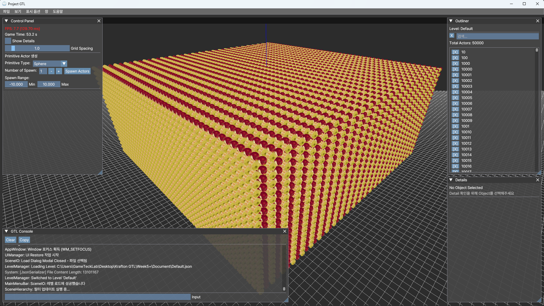 목적: Massive StaticMesh 씬에서 병목 지점을 분석하고, Realtime Rendering 환경에서의 성능 최적화 역량을 강화한다.
