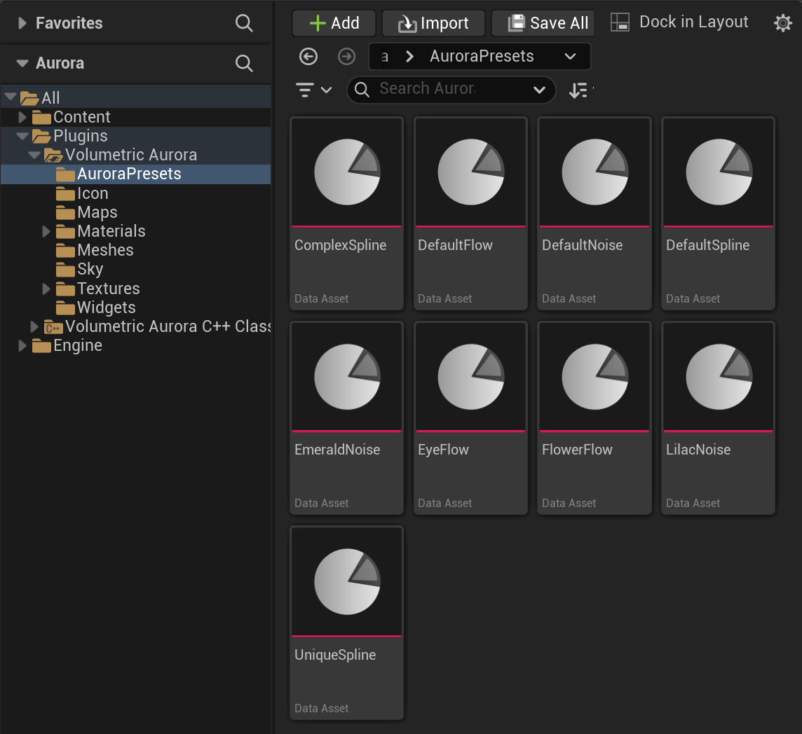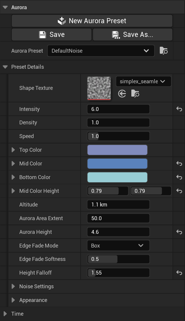 최대한 다양한 형태의 오로라를 지원하기 위해 Noise, Spline, Flow 3가지 타입을 제공합니다.